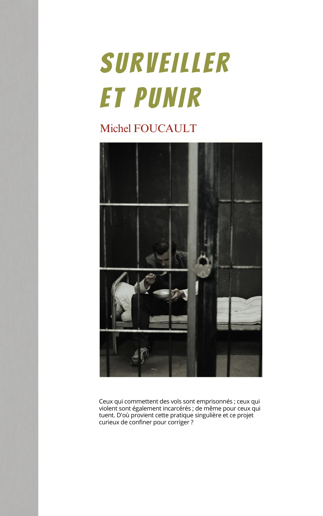 Dans *Surveiller et punir*, Michel Foucault analyse la naissance de la prison moderne et révèle comment le pouvoir, à travers l’architecture, la discipline et la surveillance (notamment le modèle panoptique), façonne et contrôle les corps bien au-delà des murs carcéraux. Une œuvre majeure sur les mécanismes invisibles du contrôle social.